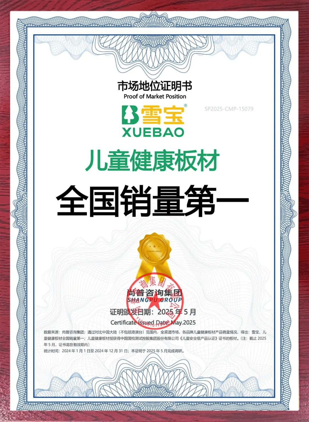近日,雪宝板材凭借卓越的产品品质与市场表现,成功斩获由尚普咨询集团颁发的 “儿童健康板材全国销量第一” 市场地位证明书。这一荣誉不仅是对雪宝板材在儿童健康板材领域长期耕耘的高度认可,更是其品牌实力与市场影响力的有力见证。