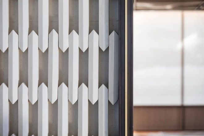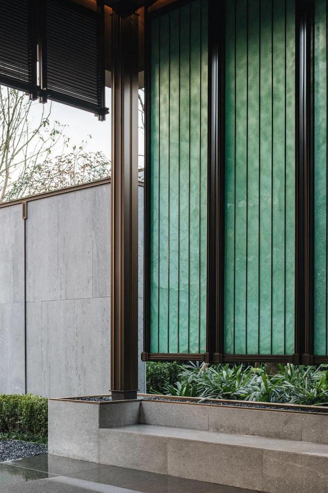 :单元门头整体和小区入口大堂呼应,两侧采用大象灰石材哑光面和拉槽面,搭配定制龙鳞纹金属网,带给业主的出入间的仕第门庭礼序,呈现了现代东方的城市风骨,尊贵感油然而生。