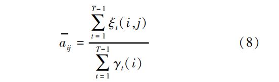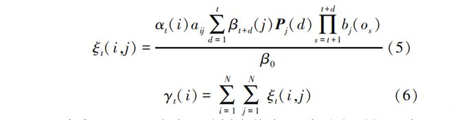 式中,ξ,(i,j)为在t时刻为状态i,在驻留时间d内由状态i转变为状态j的概率;γ,(i)为已知观测值序列,t时刻处于状态i的概率。