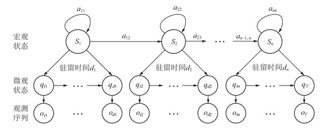 隐半马尔可夫模型(HSMM)在隐马尔可夫模型(HMM)基础上发展而来,并弥补了HMM的“马尔可夫局限性”,其拓扑结构如图3所示,其宏观状态属于马尔可夫过程,但微观状态不属于马尔可夫过程,所以被称为隐“半”马尔可夫模型。