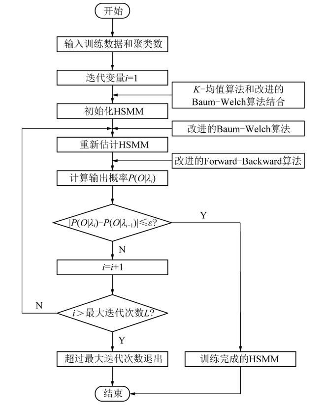 改进的Baum-Welch算法用于解决HSMM在实际应用中面临的学习问题,即在给定观测序列0的前提下,确定使λ产生0的概率P(O│λ)最大的模型参数。也就是重新估计模型参数π₀,A₀,B₀,P₀使得λ产生O的概率P(O│λ)最大。采用改进的Baum-Welch算法对模型参数进行重新估计,直到模型产生的概率最大,输出此时重新估计后的参数,这个过程也就是HSMM的训练过程。