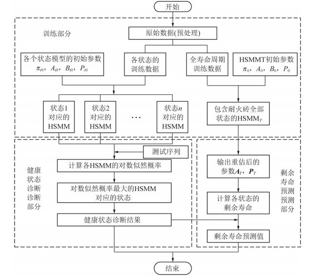 (3)剩余寿命预测。根据训练HSMM,得到的重估参数:状态转移概率矩阵A,和状态驻留时间概率矩阵P,,并在其基础上计算各状态驻留时间的均值μ和方差σ²,接着计算耐火砖各状态的最大驻留时间D。,再结合重估参数A,计算耐火砖各状态的剩余寿命RUL,最后根据测试序列0,的健康状态诊断结果预测其剩余寿命。