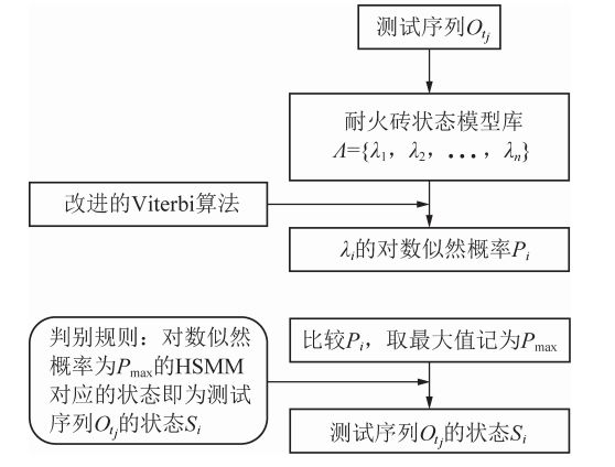 (2)健康状态诊断。耐火砖健康状态诊断流程如图6所示,总体步骤为,首先用改进的Viterbi算法计算测试序列0,和耐火砖状态模型库A中各状态模型λ的对数似然概率P₁;然后比较P,的大小,取最大值记为Pm;最后,判断状态模型库A中哪个HSMM和测试序列0,产生了最大对数似然概率Pmax,该HSMM对应的状态Si即为测试序列Otj的状态Si,也就实现了耐火砖的健康状态诊断。