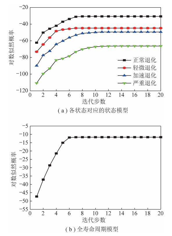 4个状态对应的状态模型和全寿命周期模型的训练过程如图7所示。其中,设定最大迭代步数为20,收敛误差e=0.0001。图7(a)为耐火砖各状态对应的状态模型的训练过程,图7(b)为全寿命周期模型的训练过程。随着训练次数的增加,各模型的对数似然概率也逐渐增加,直到达到收敛条件不再增加,也就意味着模型收敛,训练完成。各状态模型和全寿命周期模型都在20次训练以内就达到收敛,说明所构建的模型具有良好的学习能力。