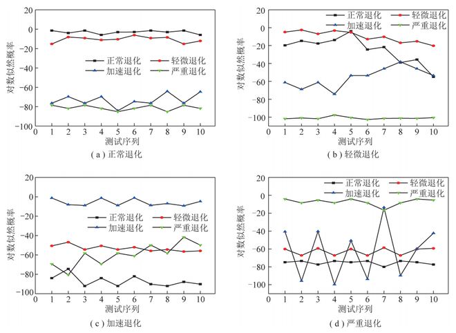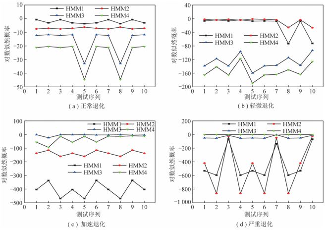 图9是各状态的测试序列和不同状态对应的HMM的对数似然概率。在图9(a)中,测试序列和HMM₁的对数似然概率始终处于最上方,符合测试序列的实际状态。在图9(b)中,在10个测试序列和HMM₂的对数似然概率中,2号和4号测试序列不是最大,这里HMM错将实际状态为轻微退化的2号和4号测试序列错误诊断为正常退化。在图9(c)中,测试序列和HMM3的对数似然概率始终最大,符合测试序列的实际状态。在图9(d)中,除7号测试序列外,其他9个测试序列和HMM₄的对数似然概率都是最大值,这里HMM错将实际状态为严重退化的7号测试序列诊断为加速退化。