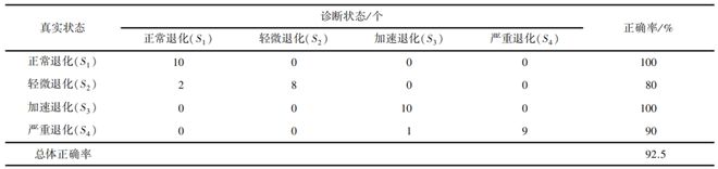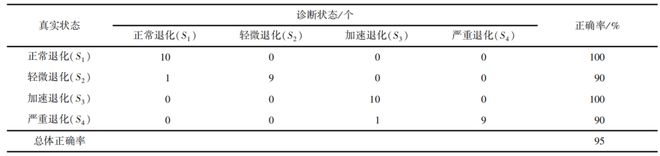 表4是基于HMM对耐火砖进行健康状态诊断的结果,对正常退化和加速退化的测试序列进行健康状态诊断的正确率均为100%,而对轻微退化的测试序列进行健康状态诊断的正确率为80%,对严重退化的测试序列进行健康状态诊断的正确率为90%。