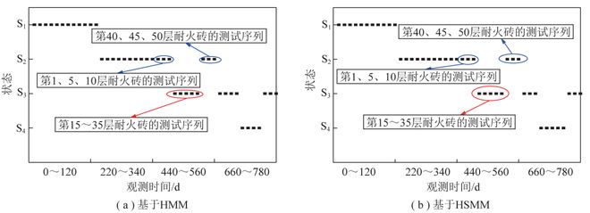 而且在同一观测时间440~560d内,蓝色圆圈圈住部分是第1,5,10层和第40,45,50层耐火砖的测试序列,它们的状态为轻微退化(S₂)。而红色圆圈圈住部分是第15~35层耐火砖的测试序列,它们的状态为加速退化(S₃)。在观测时间660~780d中也出现了同样的现象,这说明气化炉燃烧室中间位置的第15~35层耐火砖的退化程度相对其他位置的耐火砖是比较严重的,而处于燃烧室上方和下方的耐火砖退化程度较低。而在观测时间0~120d和220~340d内不同位置耐火砖的状态是一致的,这也说明了不同部位耐火砖在其寿命前期的退化程度相差不大,而随着气化炉的运行,处于燃烧室中间位置的耐火砖的退化速度不断加快,导致了退化程度的加深,以至于在耐火砖寿命后期表现出比其他位置耐火砖更为严重的退化情况。