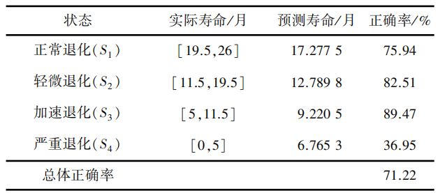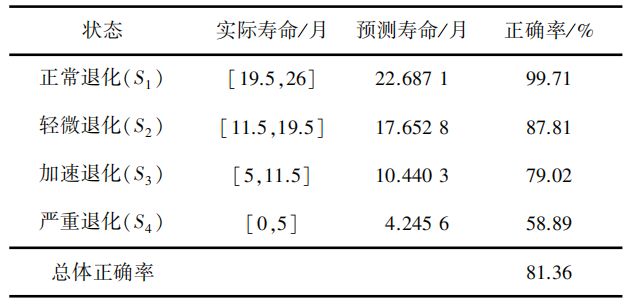 表7是基于HMM预测的耐火砖各状态的剩余寿命和实际值的对比。由表7可知,HMM得到的正常退化和严重退化的剩余寿命预测值都没有落入实际剩余寿命区间内,导致基于HMM对耐火砖进行剩余寿命预测的正确率较低,总体正确率只有71.22%。考虑是由于HMM获得的耐火砖各状态的最大驻留时间不符合耐火砖实际退化规律导致的。