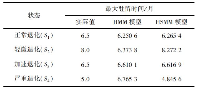 首先,根据训练气化炉耐火砖全寿命周期模型得到的重估参数计算各状态驻留时间的均值和方差,在此基础上,采用式(18)计算气化炉耐火砖各状态的最大驻留时间,并与基于HMM得到的结果进行了对比,结果见表5。基于HMM得到的耐火砖各状态的最大驻留时间几乎相等,和实际值有一定出入。而基于HSMM得到的耐火砖各状态的最大驻留时间与实际值具有相同的变化趋势。这是因为基于HMM对耐火砖进行剩余寿命预测时具有一定的“马尔可夫局限性”,它根据重估后的状态转移概率矩阵定义的状态驻留时间概率矩阵不符合耐火砖的实际退化规律,所以无法较好地描述耐火砖的退化过程。而HSMM的状态驻留时间概率矩阵是根据耐火砖的全寿命周期数据训练得到的,比较符合耐火砖的实际 退化规律,能较好还原耐火砖退化过程中不同状态的转换路径和驻留时间。
