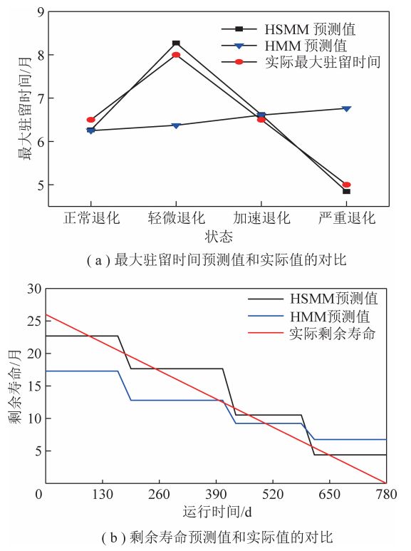 在图11(a)中可以发现,基于HSMM预测的耐火砖各状态的最大驻留时间与实际最大驻留时间具有相同的趋势,虽然最大驻留时间预测值与实际值存在一定的误差,但是相差不大,而且整体趋势相符。但基于HMM得到的预测值和实际值的趋势完全不一致,这是因为HMM定义的耐火砖状态驻留时间概率矩阵不符合其实际退化规律,不能很好描述耐火砖的退化过程,所以HSMM比HMM更适合对耐火砖进行剩余寿命预测。这也说明所建立的气化炉耐火砖剩余寿命预测模型符合耐火砖的实际退化规律。由图11(b)可以发现,基于HSMM的气化炉耐火砖剩余寿