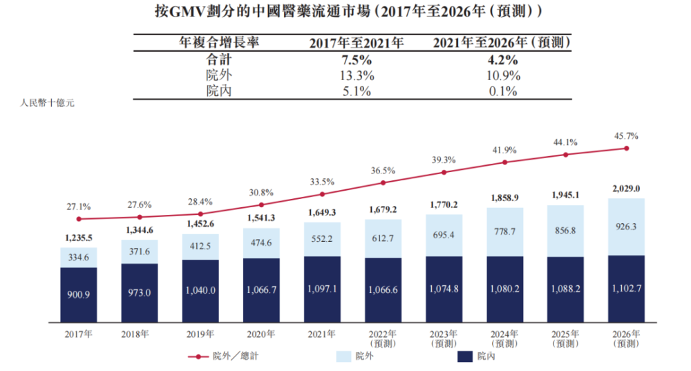 据沙利文统计,按GMV计算,2017年中国院外市场占医药流通市场的27.08%,2021-2026年,院外市场规模年均复合增速预计为10.9%,至2026年院外市场规模将达到9263亿元,医药流通市场占比增至45.65%。